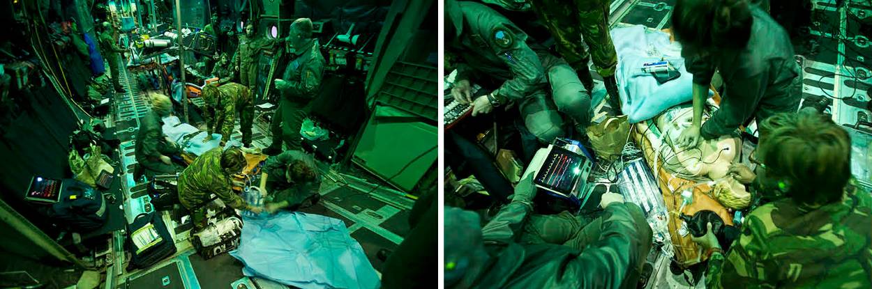 In een hectisch, maar gestroomlijnd samenspel van vliegers en loadmasters, flight nurses en artsen, anesthesiologen en intensive care verpleegkundigen moeten verschillende (oefen-) gewonden zo goed mogelijk ‘ingeladen’ en verzorgd worden.