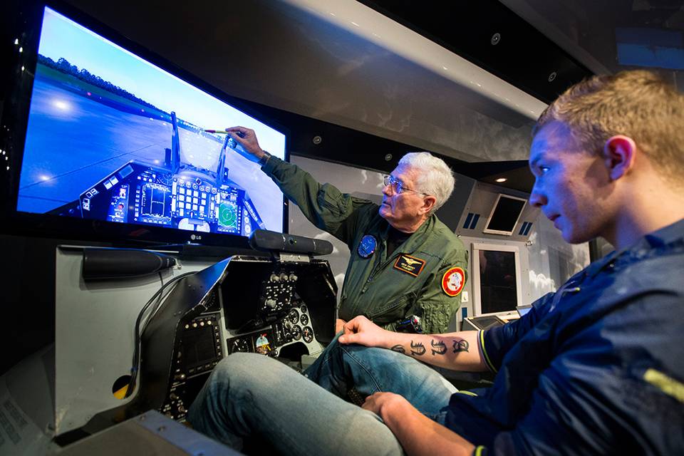 Senior engineer Meta de Hoon van de Defensie Materieel Organisatie vertelt de studenten bevlogen over de technische testen die ze doet op de wapensystemen van Defensie. De burgermedewerker doet dat voornamelijk op de F-16. De Hoon studeerde lucht- en ruimtevaarttechniek, een opleiding waarvan nu ook een afvaardiging aanwezig is. Iemand in de zaal merkt op: “Dat klinkt ontzettend interessant, maar kan dat ook in uniform? Dat vind ik veel vetter.”