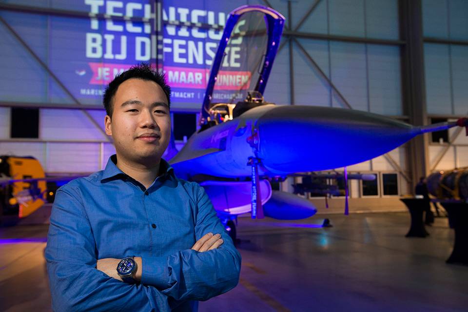 Voor student lucht- en ruimtevaarttechniek Frankie Liu (25) staat het onomstoten vast: hij wil technisch officier vliegtuigonderhoud worden. “En dan het liefst van de jachtvliegtuigen.” In augustus dit jaar rondt hij zijn stage af op vliegbasis Leeuwarden. Daar doet hij onderzoek naar het onderhoudsadministratiesysteem van de F-16. De Rotterdammer heeft er de tijd van zijn leven. “Sinds mijn 6e heb ik al interesse in vliegtuigen en bezoek zolang ik me kan herinneren alle open dagen van de luchtmacht. Het kameraadschap, het ‘1 team, 1 taak’-gevoel vind ik zo gaaf!” Hij bezoekt met twee vrienden het evenement. Liu doet dat vooral voor de gezelligheid. “Ik kwam net al collega’s uit Leeuwarden tegen!” Zijn vrienden zijn er met name om ook overtuigd te worden van een baan bij de krijgsmacht. “Ze raken steeds enthousiaster,” glundert de ex-stagiair.