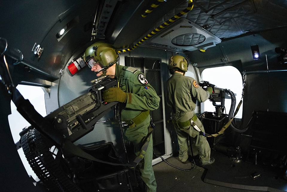 Het casco van de statische simulator – het beeld beweegt, niet de ‘helikopter’ – kan binnen een uur van type veranderd worden. Door het verwisselen van panelen staat er ineens een heel andere ‘heli’. “Alles is exact opgemeten; wapens, communicatieapparatuur en alle materialen aan boord zijn een exacte kopie van het echte materiaal in de Apache, Chinook of NH90”, zegt de ervaren loadmaster-instructeur adjudant John Bosch. “Je krijgt echt het gevoel van vliegen als je aan boord bent. Alleen mis je de koude wind in je gezicht.”