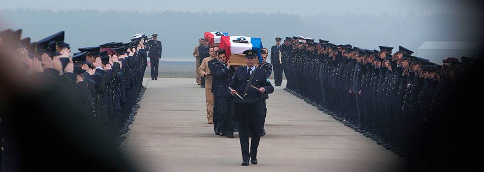 Speciaal voor de ramp ceremony vliegen sergeant-majoor John Bessems – trompettist van de Kapel van de Koninklijke Luchtmacht – en doedelzakspeler adjudant Ronald Collenteur naar Mali. Na de speech van de dominee speelde Bessems de ‘Last Post’. Collenteur loopt daarna voor de twee draagploegen uit.” Hij speelt de hymnes ‘Amazing Grace’ en de Schotse doedelzaktraditionals ‘The Dark Island’ en ‘Highland Cathedral’. “Alleen en doedelzak spelend voor een militaire rouwstoet uitlopend, is – voor zover ik weet, voor Nederland uniek”, zegt de werkvoorbereider mechanische systemen Chinook van het 980 Vliegtuig- en Helikopteronderhoud Squadron. “De reis en het optreden was onwerkelijk en is als een film aan me voorbijgetrokken. De enorme erehaag van saluerende collega’s is me het meest is bijgebleven. Het was al met al een onvergetelijke ervaring en ik ben er erg trots op dat ik dit heb mogen doen.”