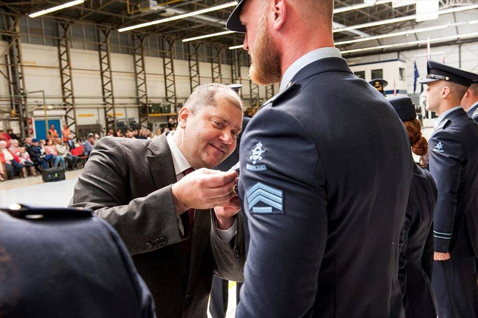 Eveneens Leeuwarden ontvingen ruim 85 militairen de Baltische Air Policing medaille (zie foto). Zij ontvingen deze herinnering als eerbetoon voor hun inzet ten behoeve van de bewaking van het luchtruim van de Baltische Staten in de periode september tot en met december 2014. De ambassadeurs van de drie Baltische Staten, Estland, Letland en Litouwen reikten het eremetaal uit.