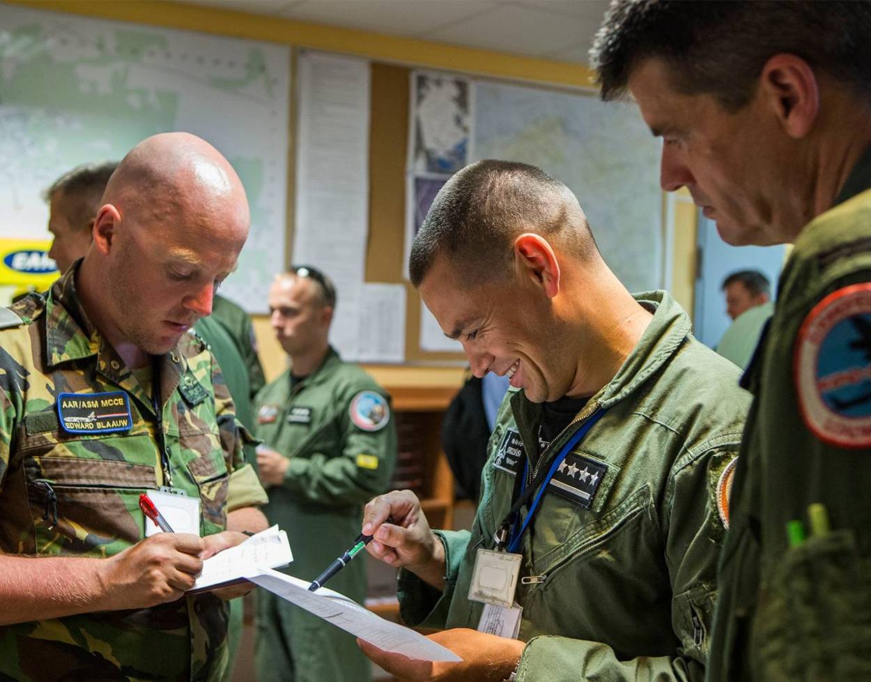 Op F-16 basis Lask houden een vlieger en boomoperator van de KDC-10 een briefing en debriefing. Edward loopt al een jaar met dit idee rond. “Ik probeer de twee werelden bij elkaar te brengen, zoals een makelaar.” Volgens Jatczak, voormalig vlieger op de MiG-21 en -29 en sinds 2010 op de F-16, is dat hét grote voordeel van deze trainingsopzet. “De debriefing laat zien welke fouten we maken. Daarvan leren we.” Hij streeft ernaar iedere beschikbare vlieger een dag en een nacht ‘hook up’ te laten maken. “Voor velen van ons is dit de eerste keer ‘s nachts, voor mijzelf ook. Overdag zijn de meesten van ons inmiddels ‘proficient’.”