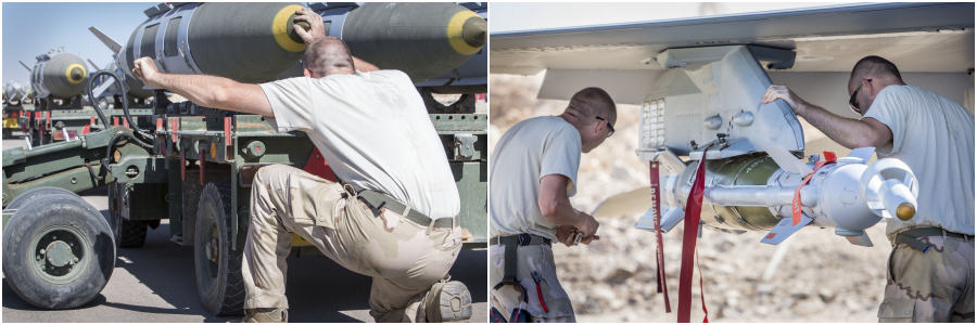 Nederlandse F-16’s gebruiken laser- en GPS-geleide bommen van 500 (227 kg) en 2000 (925 kg) pound, en sinds begin dit jaar de nieuwe Small Diameter Bomb van 250 pound (110 kilo). “We zetten juist ‘smart’ of precisiewapens in omdat je daarmee heel selectief kunt bepalen hoe een bom ontploft. Bijvoorbeeld vanuit welke hoek het projectiel komt, of met welke nevenwerking. Maar bovenal, heel precies. Je kunt een bom bijvoorbeeld onder een huis laten ontploffen. Het gaat om het effect dat je wilt bereiken.”