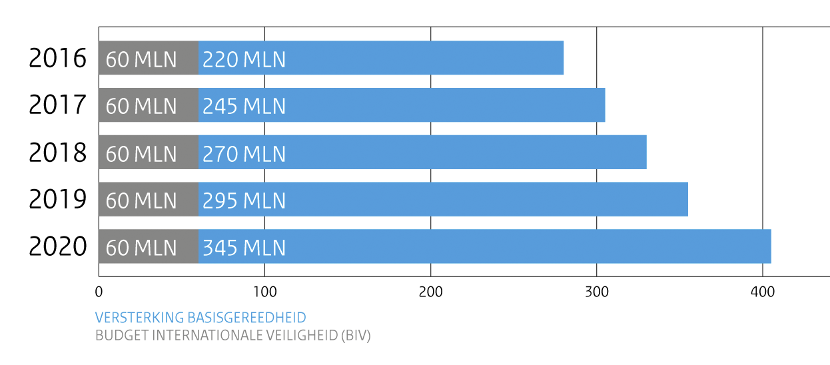 Dit bedrag maakt het kabinet voor 2016 extra vrij voor de krijgsmacht. Het budget van Defensie groeit daarna jaarlijks, tot 345 miljoen euro in 2020. Voor internationale missies zet de regering structureel 60 miljoen extra opzij, in het zogeheten Budget Internationale Veiligheid. Voor 2016 heeft de luchtmacht 633.799.000 euro te besteden.