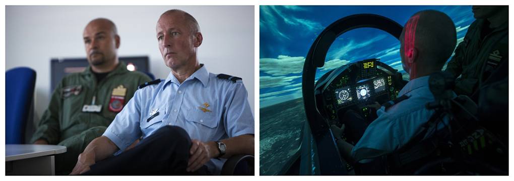 Commodore Dré Kraak volgt geïnteresseerd de veiligheidsbriefing (l.) voor de M346. Daarna probeert hij zijn vliegerhand aan de stick van het toestel in de full mission simulator.