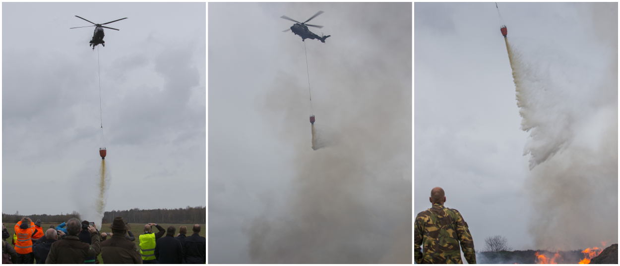 De Belgische hei staat in de fik en een flinke regenbui brengt daarin geen verandering. Om het vuur meester te maken, zijn enorme bakken water nodig. Daarom vliegen een Nederlandse Chinook en Cougar samen met een Belgische MD900 politiehelikopter af en aan. Om beurten droppen ze een paar duizend liter water op de brandhaard. En met succes.