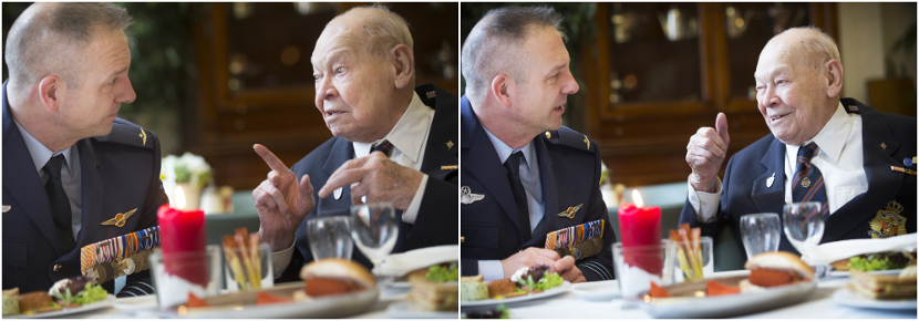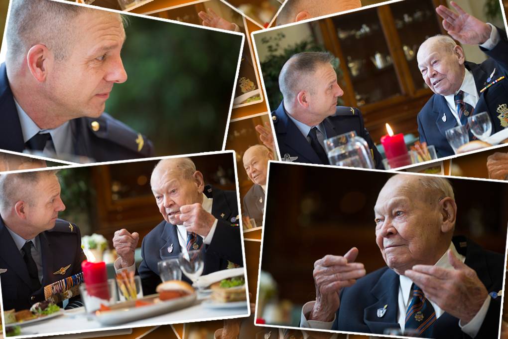 “U moet iets harder praten, want ik ben bijna doof”, roept Bernet naar Duivesteijn. “Maar niet Oost-Indisch doof hoor”, grapt hij. Ondanks zijn hoge leeftijd is de oud-mitrailleurschutter bij de tijd. De voormalig F-16 vlieger en Bernet praten over de Koninklijke Luchtmacht, Marine Luchtvaartdienst, oorlogen, B-25 Mitchell bommenwerper en F-16’s. “Niet alleen het Vliegerkruis, maar vooral het militaire aspect is iets wat ons vandaag verbindt”, zegt Duivesteijn. “Oudgedienden zijn in hart en nieren vaak nog militair en dat is een passie die mensen dichter bij elkaar brengt.” Volgens de overste zijn de verhalen van Bernet en zijn tijdsgenoten bijzonder. “Ik voel me ontzettend dankbaar dat ik deze oud-strijder hier vandaag mag ontmoeten. De persoonlijke aandacht doet veel met mij.”