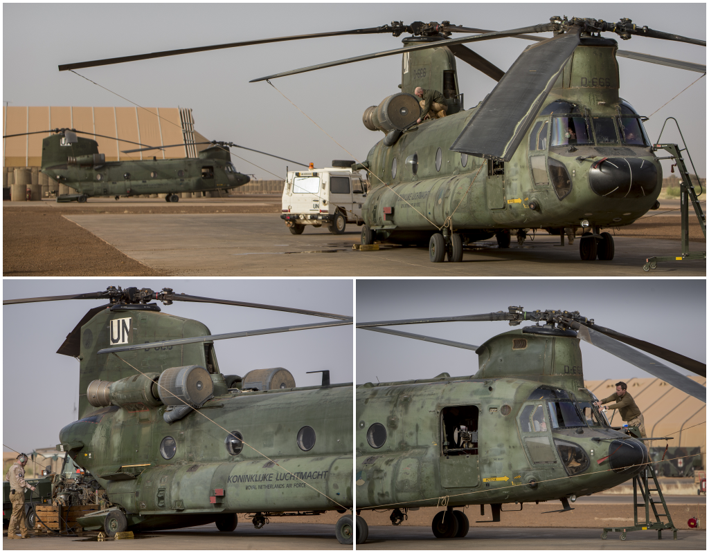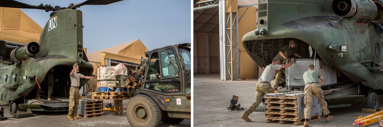Hoewel bevoorraden voor de transporthelikopterbemanning bijna dagelijkse kost is, blijft het werk in Mali uitdagend. “We vliegen hier onder extreme omstandigheden”, legt Groothuis uit. “Hoge temperaturen, donkere nachten en een stoffige werkomgeving. Het is dus belangrijk om de systemen in de gaten te houden. De systemen van de Chinook krijgen heel wat te verduren door het fijne zand, maar door regelmatig goed onderhoud te plegen, vangen we dit op.”