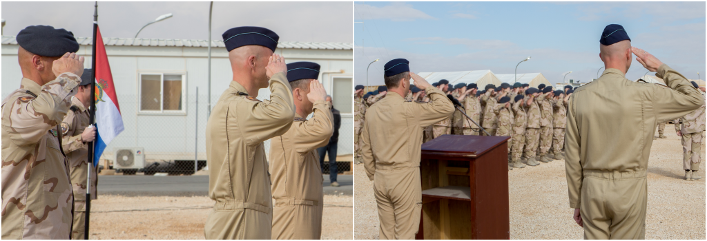 ‘Membres du détachement six, nous y sommes! Un détachement mixte composé de Belges et de Néerlandais, avec une tâche claire, fournir un soutien à la guerre contre ISIS.’ Hiermee opende de commandant van gemixte Belgisch- Nederlandse detachement 6, na de officiële overdracht, zijn toespraak. Foto’s: KLu