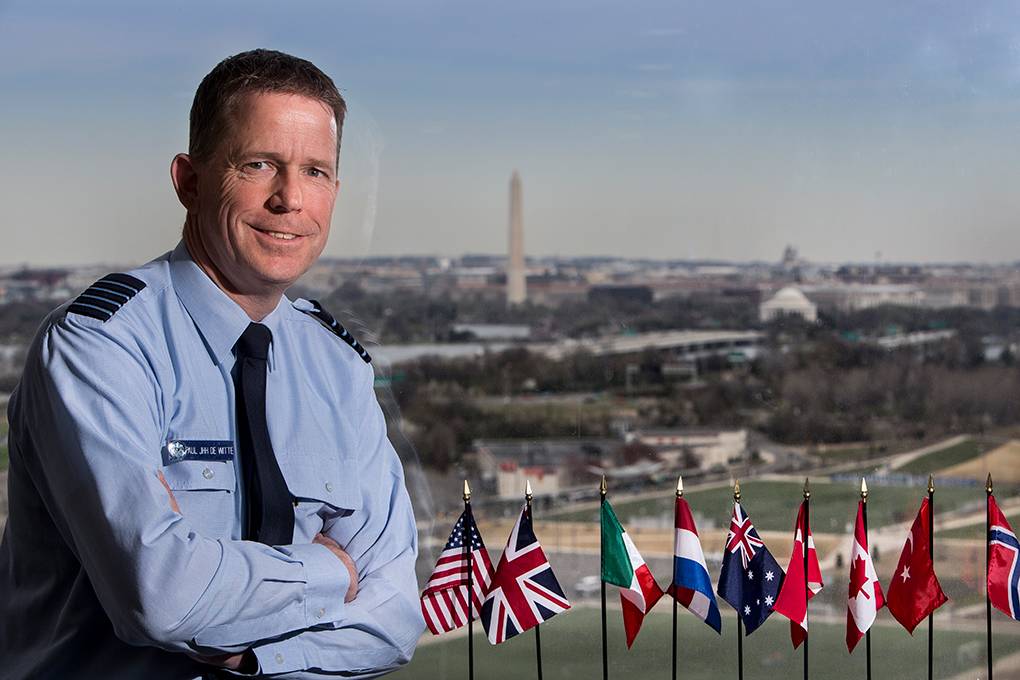 Omdat er pas 2 Nederlandse F-35’s vliegen en ook nog eens buiten Nederland, kan de indruk ontstaan dat het 5e generatie-jachtvliegtuig klinkt als toekomstmuziek. Onterecht, vindt kolonel Paul de Witte, de Nederlandse National Deputy van het Integrated Directorate van het JSF Program Office in Washington. “Er zijn al meer dan 170 stuks gebouwd; het is bepaald geen ‘papieren’ vliegtuig meer.” Met 8 landgenoten bewaakt De Witte in de Amerikaanse hoofdstad de belangen van de Nederlandse overheid én industrie.