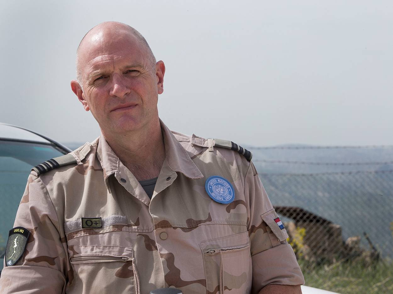 “De missie UNTSO stond al lang op mijn verlanglijstje. Het leek me geweldig om te doen, een jaar lang een bijdrage te leveren aan de beheersing van 1 van de oudste conflicten ter wereld. Het is misschien de bekende druppel op de gloeiende plaat, maar je moet niet doen of er níets verandert, dus waarnemen en rapporteren aan de VN. Als je écht niets doet, dan verandert er zéker niets. Ik heb genoten van mijn uitzending. Ik zie het met mijn 56 jaar, als het laatste cadeautje tijdens mijn operationele dienst. Het ongebreidelde enthousiasme van de nieuwe observers als ze binnenkomen bij UNTSO, viel me het meest op. Dat had ik zelf ook. Prachtig als je hun grote ogen ziet als je ze ophaalt en wegwijs maakt. Soms is het wat lastig dat je hele uitzending vol te houden, want iedereen vertoont wel eens sporen van metaalmoeheid. Dat is menselijk.