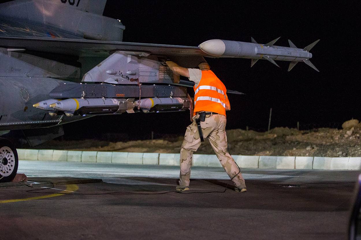 Is het niet jammer om te vertrekken, juist nu de strijd tegen ISIS vruchten afwerpt? Daar hoeft de detco niet lang over na te denken. “Nee, het is tijd”, zegt hij resoluut. “We zijn al jarenlang bezig met missies en nu is het tijd om te herstellen.” Bovendien moeten de vliegers qua training nog wat inhalen. Door de missies in Afghanistan en Irak zijn zij zeer bedreven geraakt in de uitschakeling van gronddoelen. “Maar de kans was zeer klein dat we ineens te maken kregen met vijandelijke vliegtuigen. Dat soort operaties in het hoogste geweldsspectrum zijn totaal anders en moeten we weer trainen.” Foto: sergeant 1 Joyce Rutjes