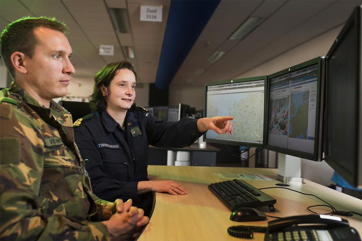 Wat zou het KNMI zonder de luchtmacht zijn? Toen het in Nederland wereldberoemde weerinstituut op zaterdag 17 september als donderslag hij heldere hemel zonder stroom kwam te zitten, reisden personeelsleden snel naar de Joint Meteorologische Groep (JMG) op de vliegbasis Woensdrecht. Daar slaagden ze erin om alsnog de weersverwachtingen voor die dag te maken. Toen het KNMI aan het einde van de avond weer stroom had, keerden ze terug naar De Bilt. Het één-tweetje tussen de JMG en het burgerweerinstituut kwam niet uit de lucht vallen. Beide werken al jaren samen. De 55 specialisten van de Joint Meteogroep voorzien de Nederlandse en NAVO-troepen wereldwijd van actuele weerinformatie. Foto: Defensie