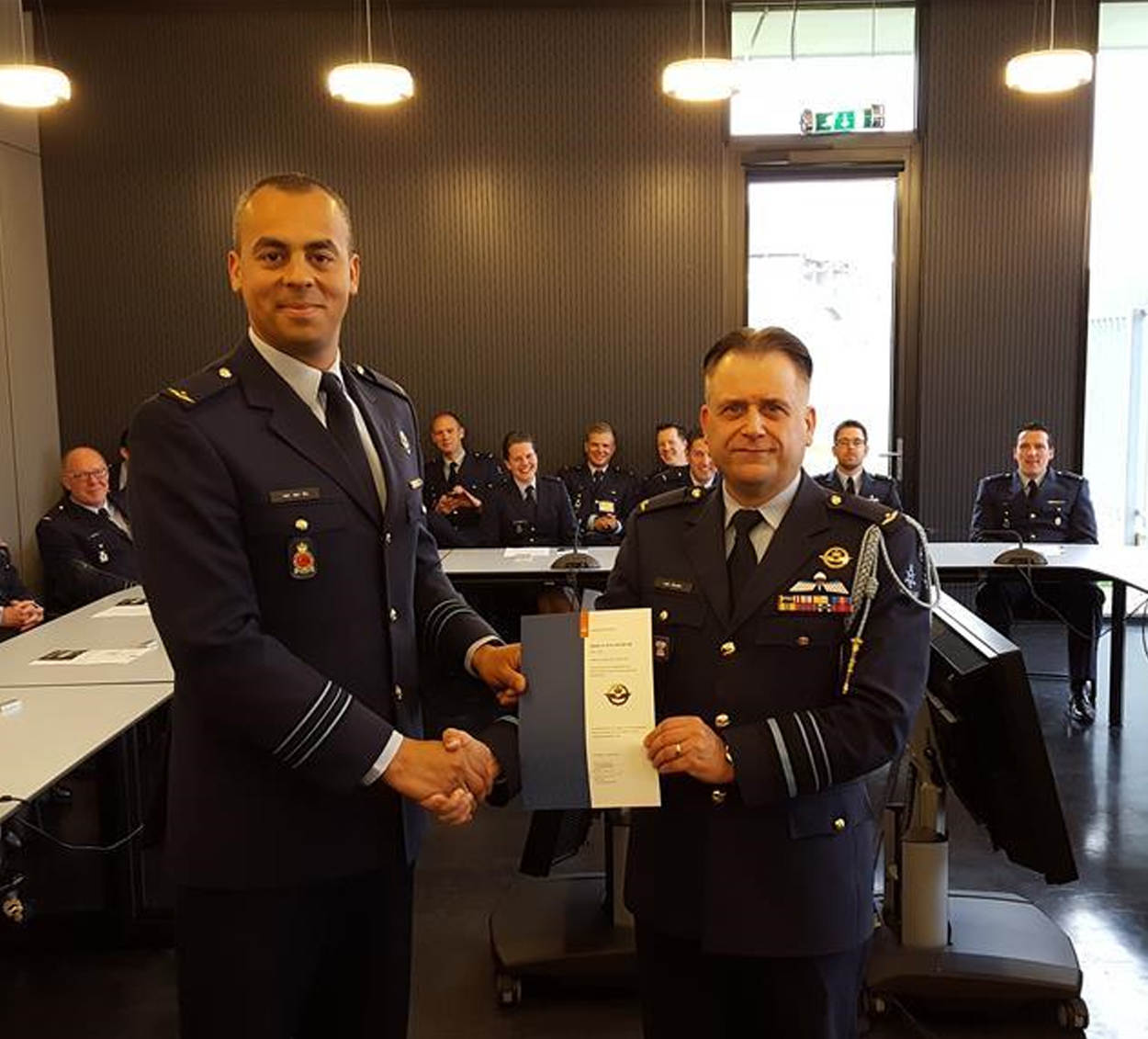 Samen met 30 deelnemers uit 13 verschillende landen namen sergeanten 1 Boaz Hardijzer (802 Squadron) en Johan Blom (130 Squadron) in maart en begin april deel aan de Inter European Air Force Academy. De focus van deze opleiding, verzorgd door US Air Force op Ramstein Airbase, ligt op leiderschap en het leren van verschillende culturen. Het zorgt voor verbreding voor de verdere ontwikkeling van luchtmachtonderofficieren. Foto: USAFE