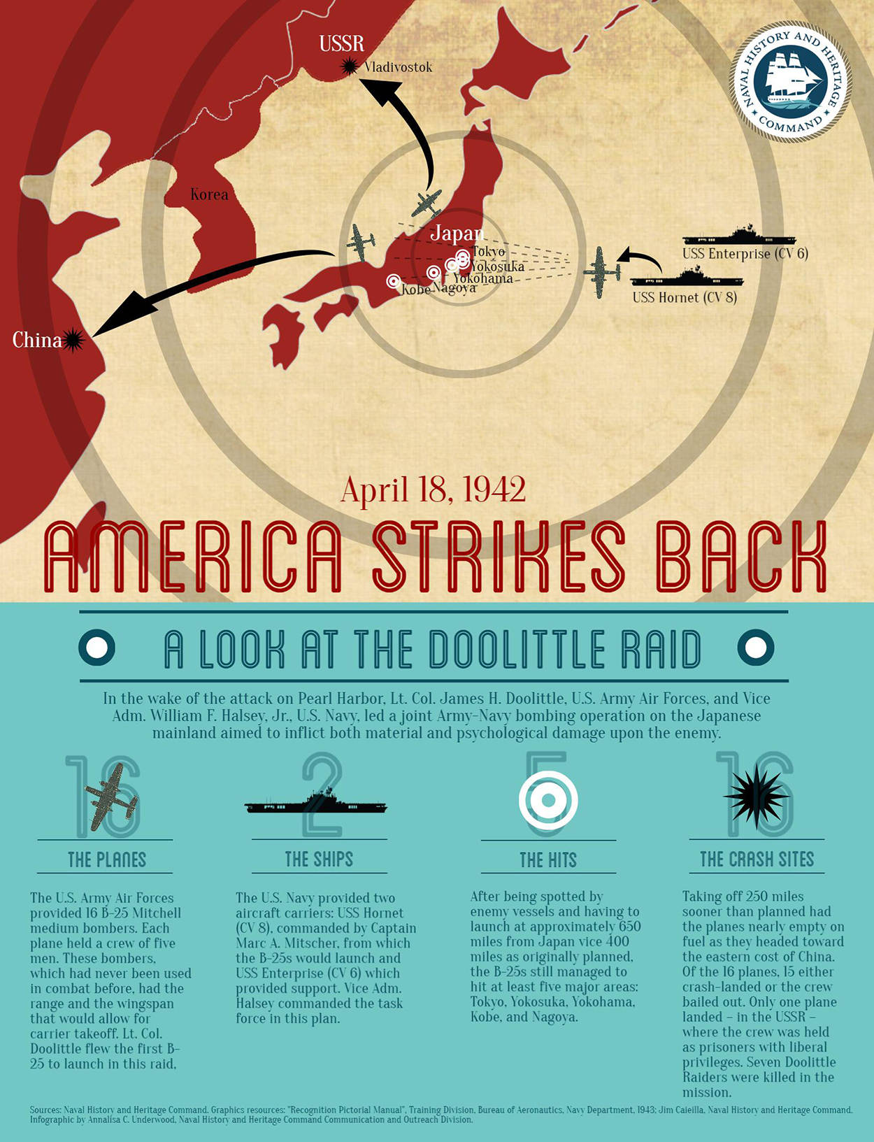 Vrijwel direct na de vernederende Japanse aanval op Pearl Harbor op 7 december 1941 geeft de Commander-in-Chief, president Franklin D. Roosevelt aan dat hij een aanval op Japan wil uitvoeren. Die aanval op Tokyo, midden april 75 jaar geleden, is vernoemd naar de commandant van de bommenwerpers, luitenant-kolonel James “Jimmy” Doolittle. De 16 Amerikaanse B-25 bommenwerpers  veroorzaken niet veel schade, maar het psychologische effect is reusachtig: Japan is niet onverslaanbaar. De 'Doolittle Raid' is daardoor een eerste keerpunt in de oorlog.
