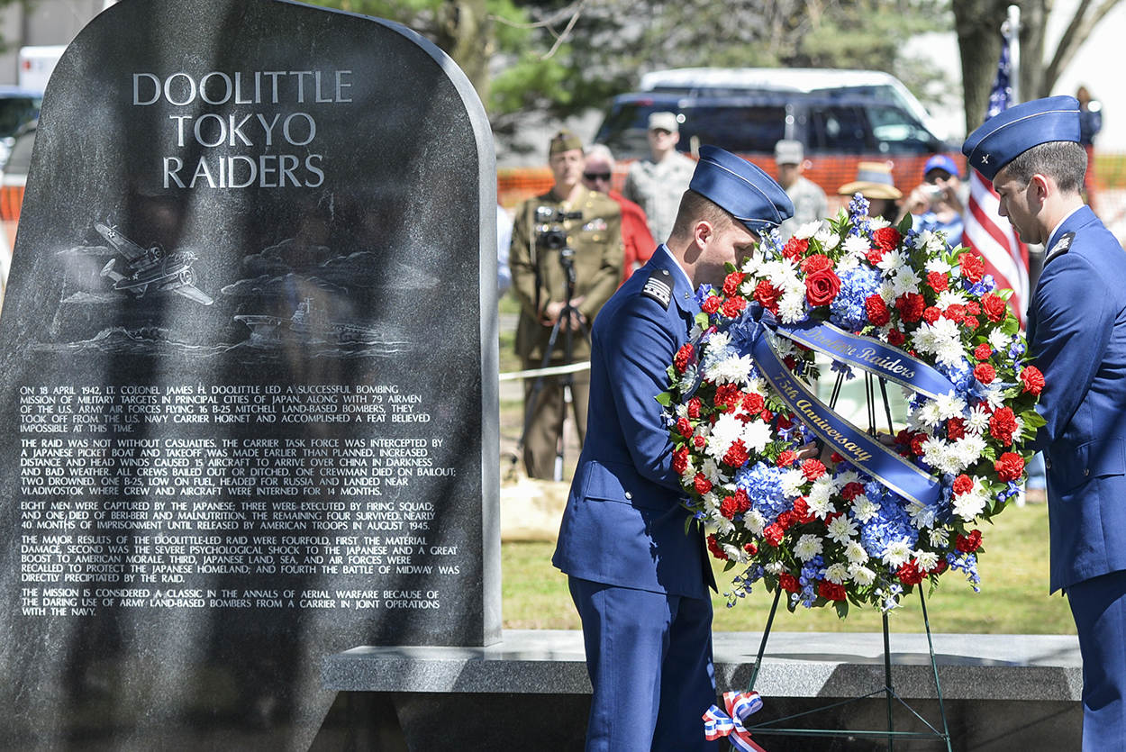 Sinds de Tweede Wereldoorlog wordt de Doolittle Raid ieder jaar herdacht. Bij de 75ste herdenking legden cadetten van de U.S. Air Force een krans bij het monument in Dayton Foto: Wesley Farnsworth.