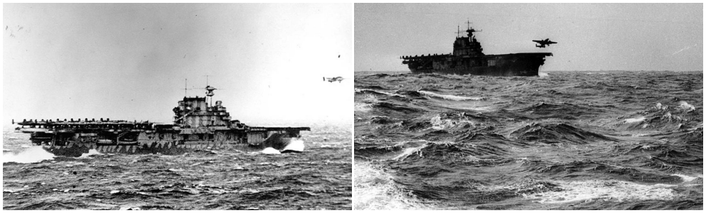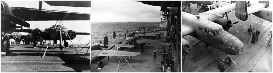 De B-25's staan goed vastgesjord aan dek. Ook is duidelijk dat de eerste Mitchell nog geen derde van het dek als startbaan heeft. De laatste - uiteraard - het hele vliegdek.