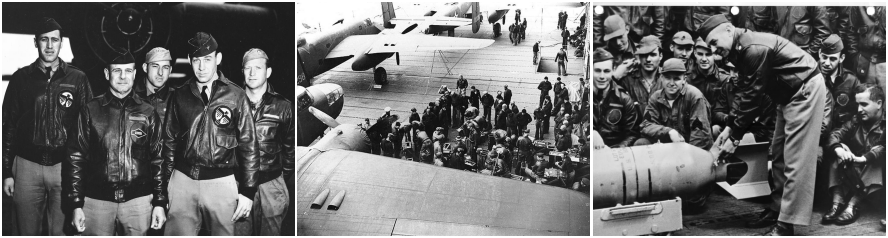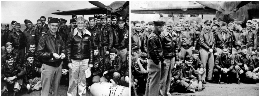 Vliegtuigbemanning aan boord van de Hornet. Links de bemanning van Doolittle. De commandant zelf is 2e van links, zijn co-pilot Richard Cole – de laatste overlevende van de missie – is 2e van rechts.