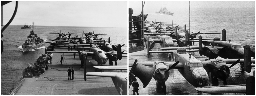 B-25’s op het dek van de Hornet. De grote bommenwerpers slokken aan dek alle ruimte op. Landen is onmogelijk. Het is een one-way mission.