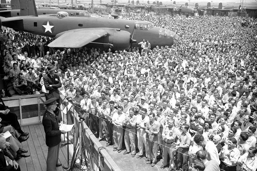Terug in de USA bedankt - inmiddels - brigadegeneraal Doolittle in juni 1942 de medewerkers van de North-American in Inglewood, California. De B-25's werden overigens in Minneapolis verbouwd voor hun speciale missie.