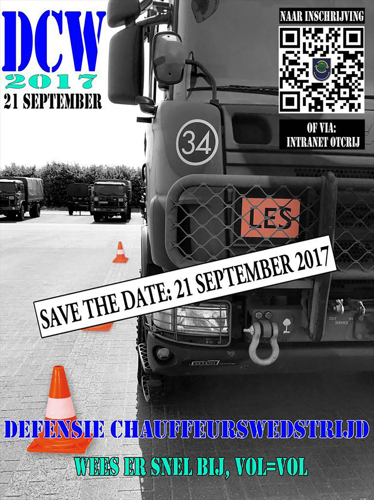 Snel inschrijven, want vol is vol. Doe dat in 1 van de 3 categorieën: Cat B - MB 290GD, Cat C – YA 4442 met aanhangwagen 15 kN of Cat C – SCANIA (ALK is niet benodigd). U kunt deze dag slechts deelnemen aan 1 van deze wedstrijdcategorieën. Defensiemedewerkers, zowel burger als militair, dienen in het bezit te zijn van een geldig militair rijbewijs voor de ingeschreven categorie. De wedstrijd vindt plaats op het OTCRij in Oirschot, van 07:30 uur tot 17:30 uur. De dag wordt afgesloten met een maaltijd en de prijsuitreiking. Schrijf in via http://goo.gl/aK6mF9 of via de link op de intranetpagina van OTCRij. Militaire rijinstructeurs en -examinators zijn van deelname uitgesloten. Buitenlandse militairen doen buiten mededingen mee.
