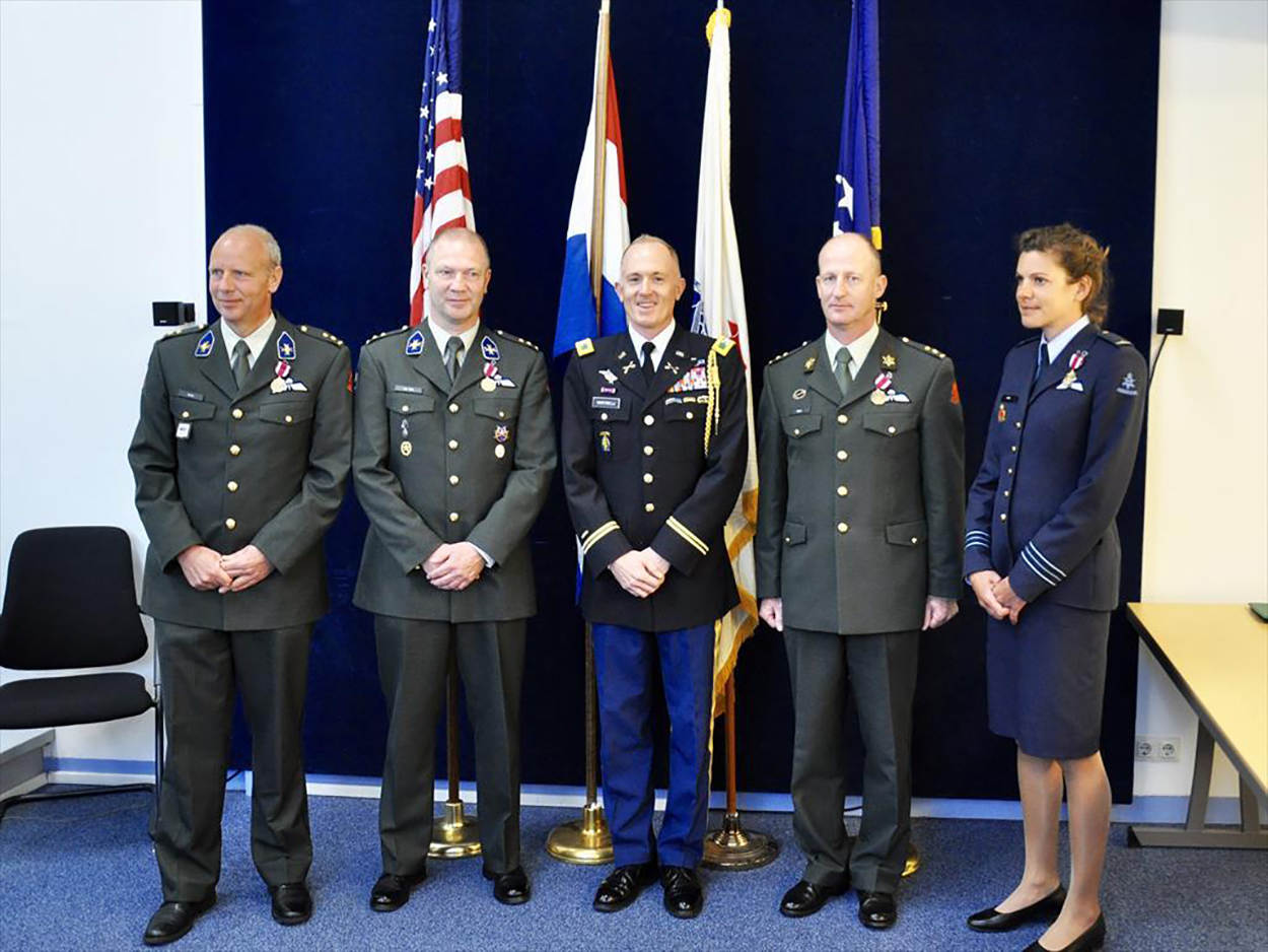 Het gaat om de overstes Marcel Wolfs, Albert van Dijk, Peter Floor en majoor Joyce Kivits. Zij maakten deel uit van de joint multinationale civiel diplomatieke missie van de United States Security Coordinator for Israel and the Palestinian Authority (USSC, meer hierover in de Vliegende Hollander 5 van 2016). Dat heeft als doel het Palestijnse veiligheidsapparaat te ondersteunen bij de professionele uitvoering van de taken in de Palestijnse gebieden. Het hoofd USSC luitenant-generaal Frederick S. Rudesheim kende de onderscheidingen toe. De Amerikaanse Defensieattaché kolonel Vincent Martinelli reikte ze uit. Foto: Defensie