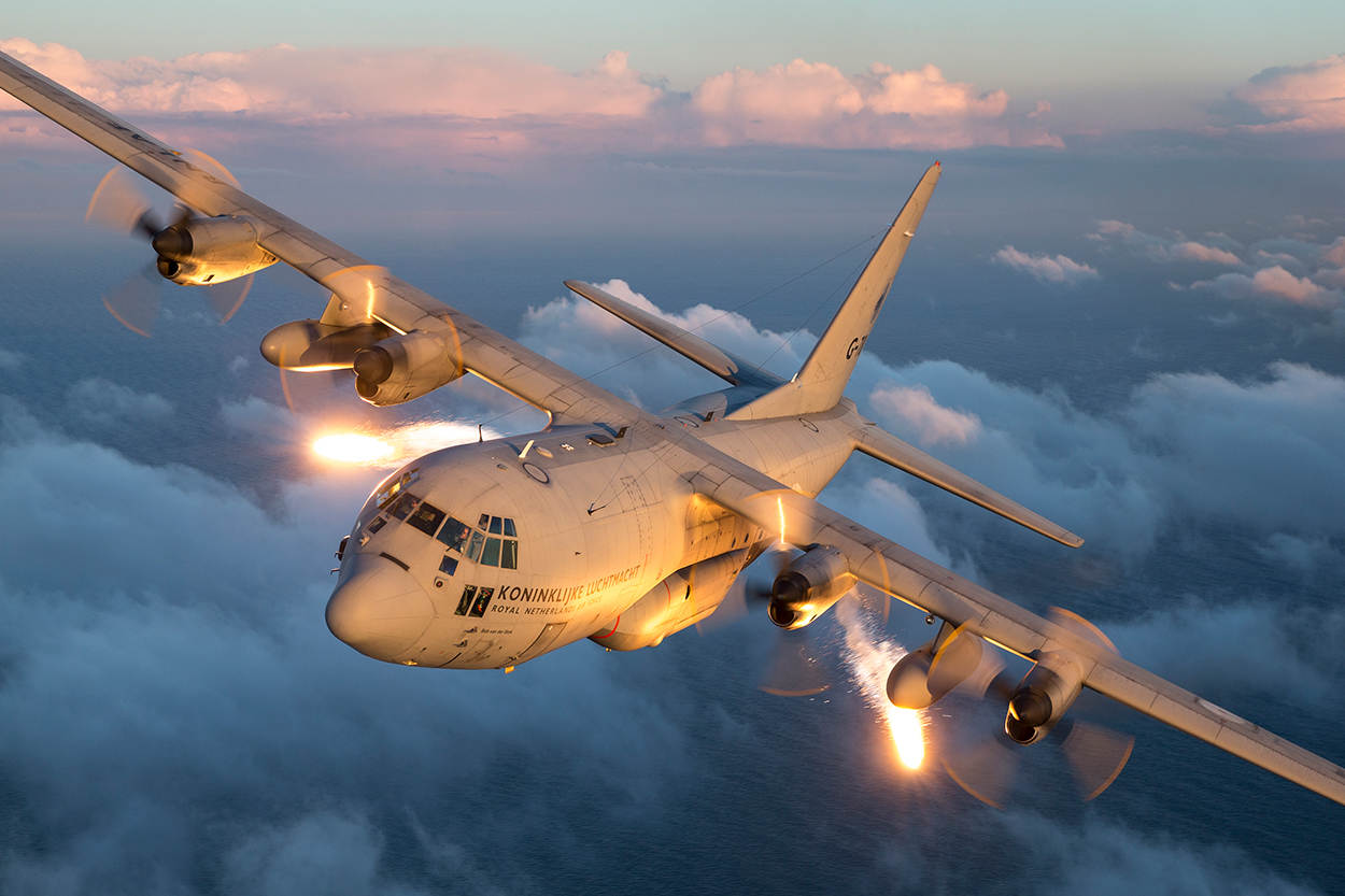 Foto onder: Met flares probeert de crew van de C-130 een vijandelijke F-16 van zich af te houden. Foto: Frank Crébas
