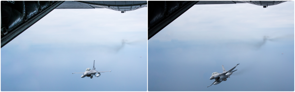 Het heeft wat weg van een luchtgevecht en zo is het ook bedoeld. Scherp draaiend en gebruikmakend van zijn zelfbeschermingsmiddelen, probeert een C-130 van het 336 Squadron boven de Noordzee een ‘vijandelijke’ F-16 van zich af te schudden. De kist piept en kraakt door de optredende zwaartekracht. Hercules en F-16 vliegers trainen voor het eerst in een gezamenlijke wapeninstructeurscursus.