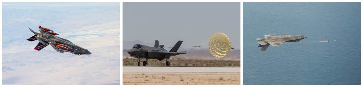 Ook slechtten de F-35’s in diverse testvluchten het afgelopen jaar meerdere mijlpalen. In zogeheten ‘edge of the envelope’-manoeuvres testten vliegers de constructie, systemen en besturing van de F-35. Zo waren er testen met externe ladingen GBU-31’s, 2,000 pounds Joint Direct Attack Munition, testen met remparachutes voor de Noorse luchtmacht en proeflanceringen van AIM-9X Sidewinders, maar dan ondersteboven. Ook beproefden testvliegers divers Britse wapensystemen en vlogen ze complexe missies met meerdere toestellen. Foto’s: Darin Russell, Jonathan Case en Dane Wiedmann, Lockheed Martin
