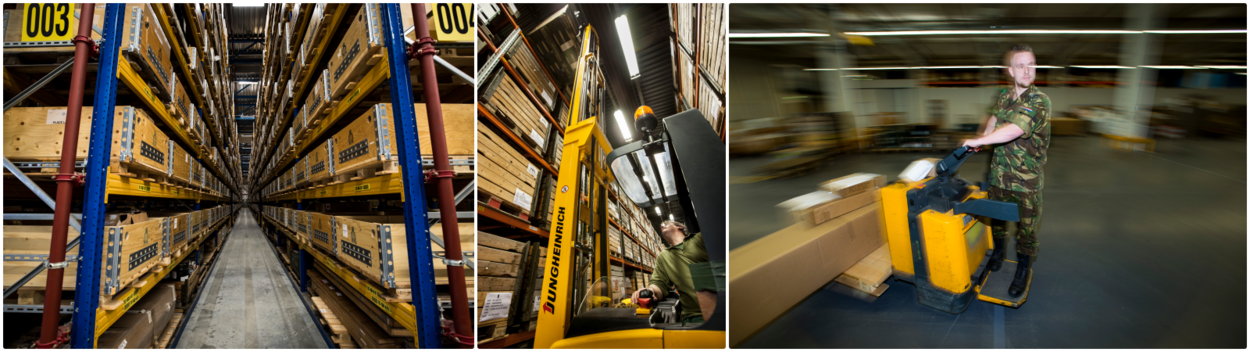 Veel is geautomatiseerd, maar handwerk blijft onontbeerlijk in het nieuwe warehouse. Foto midden: sergeant-majoor Maartje Roos.