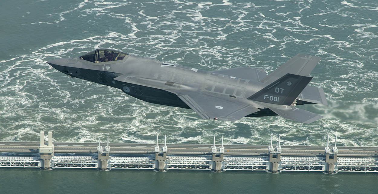 Foto onder: De eerste Nederlandse F-35 over een typisch Nederlands tafereel: de Deltawerken. Foto: Frank Crébas