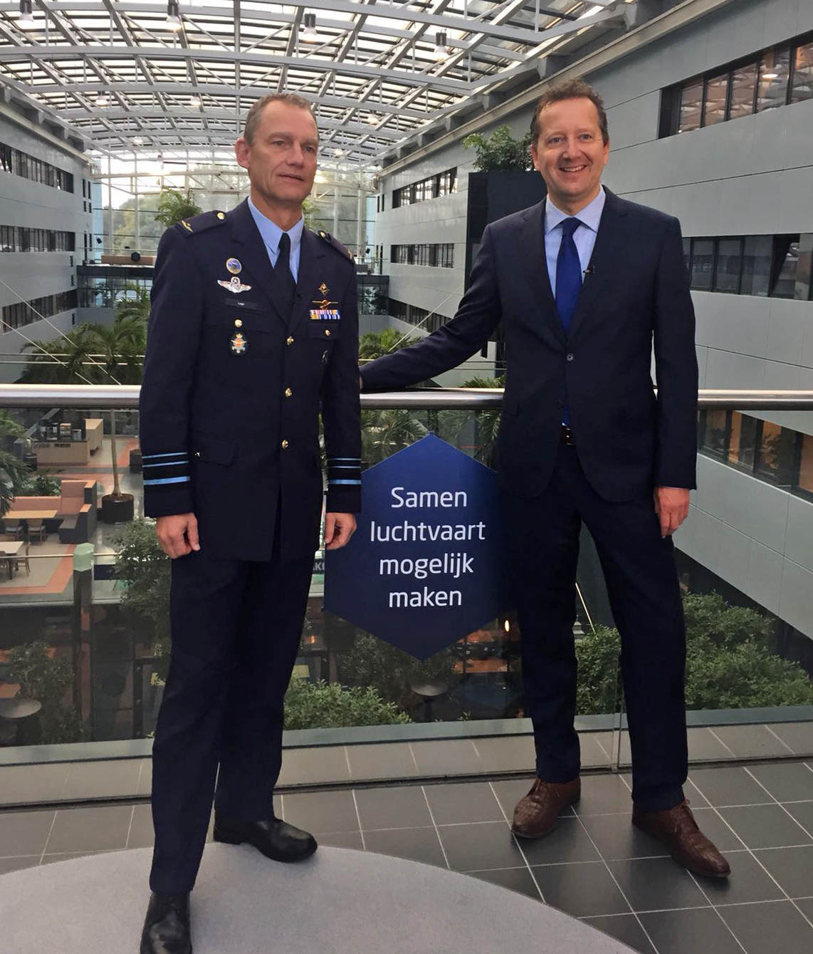 C-LSK Luyt (l.) en directeur LVNL Dorst hebben elkaar helemaal gevonden op Schiphol-Oost.