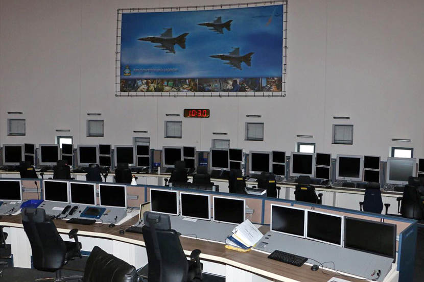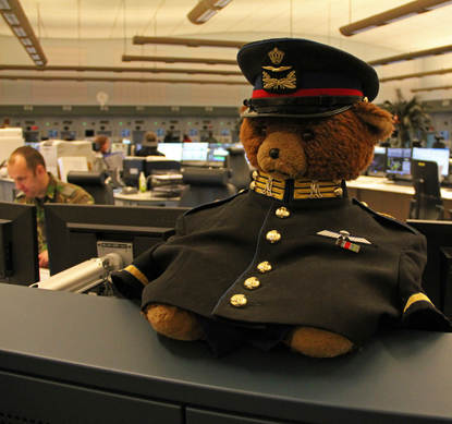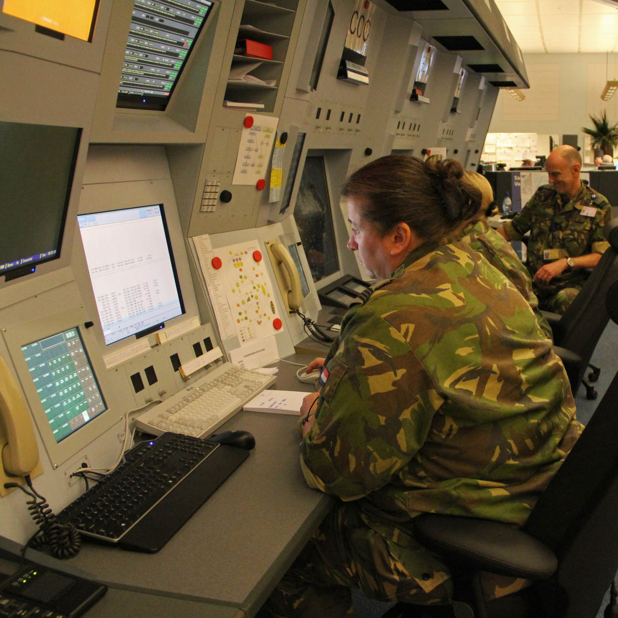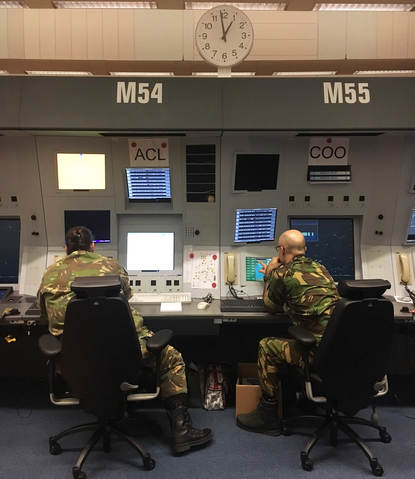 Luchtmachters werken net als op het AOCS naast elkaar. De civiele collega's zitten net zo, aan de rugzijde van hun militaire evenknieën.