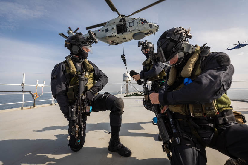 De Koninklijke Marine, politie, Kustwacht Nederland, gemeenten en havenbedrijven doorliepen een week lang verschillende scenario’s. Er werd geoefend op zee en in de havens van IJmuiden en Amsterdam. Voor ondersteuning vanuit de lucht was het 860 Squadron aanwezig met een NH90. Foto: Martijn Beekman