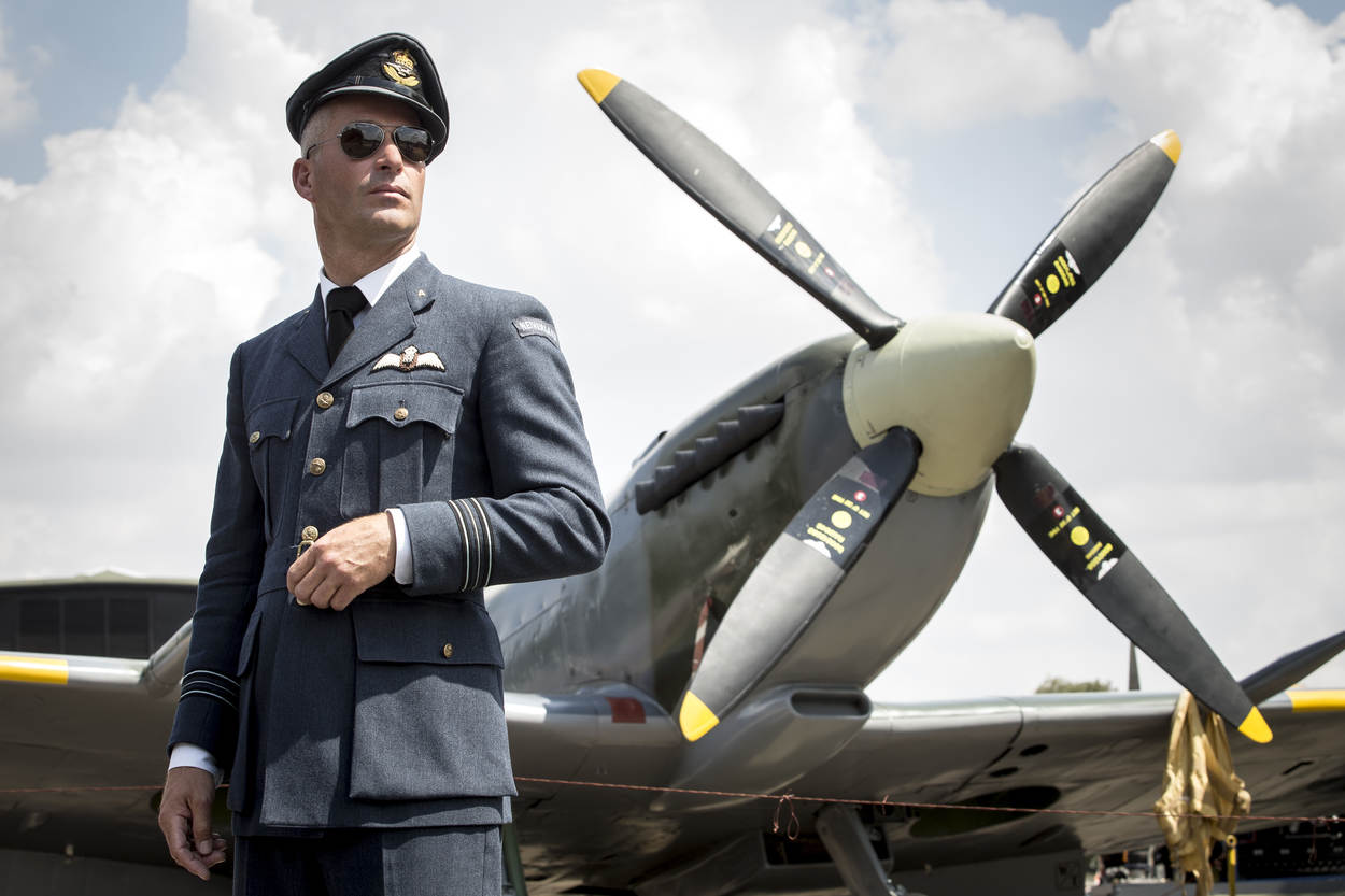 Achtergrondfoto's: Voor het oog 75 jaar terug in de tijd: re-enacter Christian Goossen van Living History Group ‘The Merlins’ voor een Spitfire op Duxford.