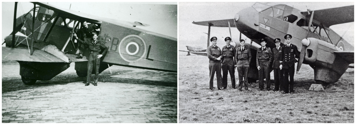 Twee foto’s van Nederlandse Dominies in de RAF-tijd, waarbij de linker foto ook nog een Percival Proctor toont, wellicht een Nederlandse. Foto’s: uit archief Nederlands Instituut voor Militaire Historie