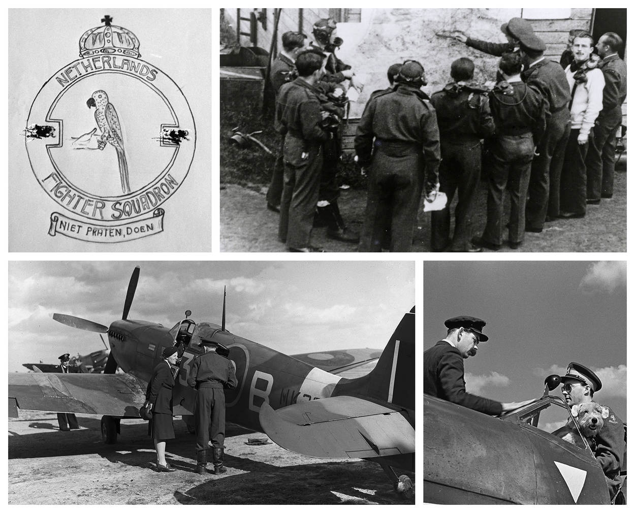 Boven: Het eerste ontwerp van het 322 squadronlogo en vliegers die missie-instructie krijgen. Onder: Prins Bernhard gaat geregeld langs bij 322, zoals in mei 1944. In september 1944 komt ook prinses Juliana op bezoek. Foto’s: uit archief Nederlands Instituut voor Militaire Historie en Nationaal Archief