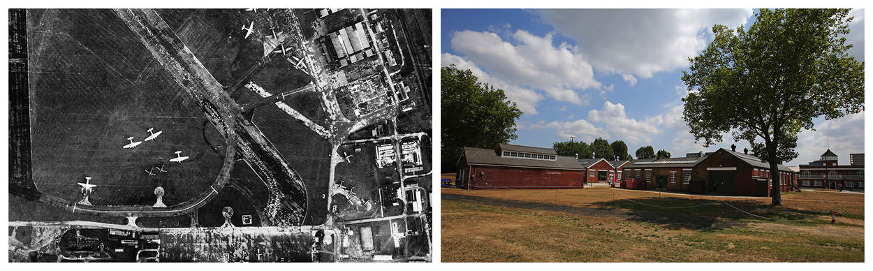 Links RAF Hendon op 29 januari 1946, rechts enkele historische gebouwen die er nog van over zijn. Op de foto links staan deze rechtsonder. Hendon is nu de Londense vestiging van het RAF museum. Foto l.: Imperial War Museum. Foto r.: Arno Marchand