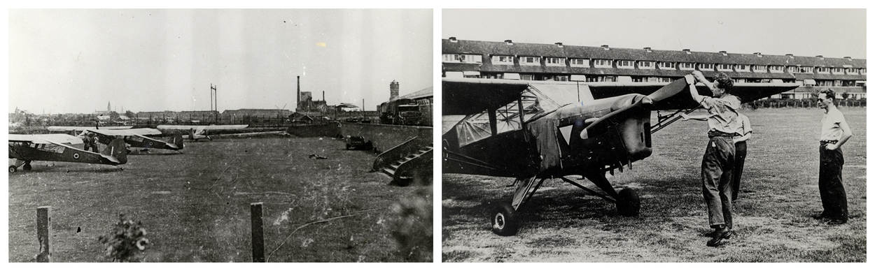 Austers op het noodvliegveld aan de Hoekwaterstraat in Voorburg. De toestellen vliegen nog ‘gewoon’ in RAF-kleuren met Nederlandse driehoek op de neus. Foto’s: uit archief Nederlands Instituut voor Militaire Historie