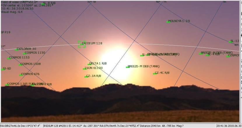 Recent kwamen via sectie communicatie Vliegbasis Leeuwarden bovenstaande foto’s binnen bij meteobriefer luitenant Marcel Tubben van Vliegbasis Leeuwarden. De vraag bij de oplichtende stip met zweem lag voor de hand: welk verschijnsel zien we hier? Het antwoord lag niet voor de hand en Marcel riep de hulp in van majoor Willem-Pieter van der Laan, van de JMG. Een reflectie van het licht van de ondergaande zon lag voor de hand, maar op welk object en vanwaar die zweem? De linker foto was geschoten om 20.41 uur, de rechter rond 20.52 uur. Zou het een satelliet zijn? Van der Laan riep de hulp in van kapitein Michel Bulte van het SSC. Daar houdt men zich onder ander bezig met het catalogiseren van objecten in een baan rond de aarde. Michel vulde de gegevens in en wat bleek: juist waar de stip zich bevond, berekende de computer satelliet Iridium 128 (foto onder). Toen rees de vraag, kan zo’n satelliet zoveel licht van de zon reflecteren dat het in de schemer zichtbaar is? Het antwoord luidt: ja. De Iridiumsatellieten bevinden zich in een lage baan boven het aardoppervlak en hebben antennes en zonnepanelen aan boord die zo groot zijn als deuren. Die kunnen lichtflitsen geven zo sterk dat ze bij daglicht op aarde te zien zijn.
