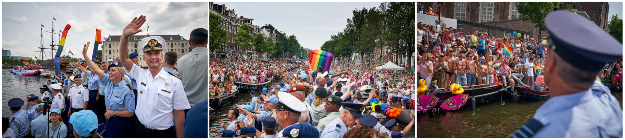 Het thema ‘Salute our Heroes’ werd door het publiek langs de kant met oorverdovend applaus ontvangen en beantwoord met saluerende toeschouwers. Hartverwarmend, vond vice-admiraal Arie Jan de Waard, Directeur Defensie Materieel Organisatie. “Zo mooi om dit te ervaren. Trots zijn op wie je bent en wat je doet, daar gaat het om. Deze dag is een steun in de rug voor alle medewerkers van de krijgsmacht. Ik ben onwijs trots dat we kunnen laten zien dat er bij Defensie plek is voor íedereen. Sekse zit tussen de benen, gender tussen de oren.” Het is de 10e keer dat Defensie meevaart tijdens de Canal Parade, waarvan 8 keer met een eigen boot. Voor een plekje aan boord konden zowel burgers als militairen zich aanmelden. Foto’s: Phil Nijhuis