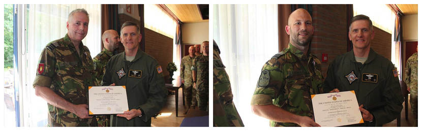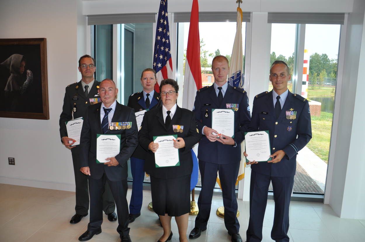 Majoors Rob van Pelt en Dennis Vermeulen kregen onlangs de Defense Meritorious Service Medal opgespeld uit handen van lieutenant-general Tomothy M. Ray, Deputy Commander van het United States European Command.