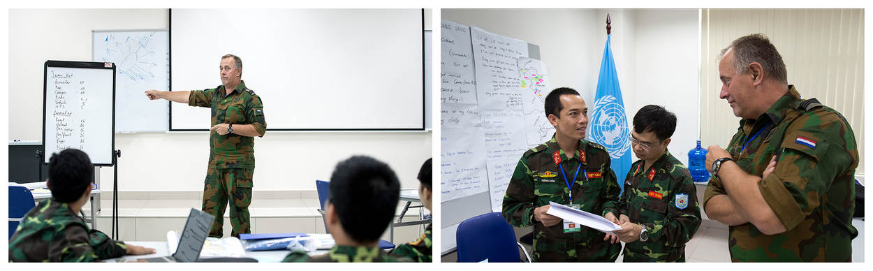“De cursisten – allemaal officieren – worden wellicht als waarnemer naar een VN-missie gestuurd”, legt Ruud uit. “Daarnaast leiden wij als MTT onze Vietnamese counterparts van het Peacekeeping Training Center op zodat zij deze opleiding straks zelfstandig kunnen geven. Die zitten dus ook in de klas én spreken goed Engels. Ik verwacht dat ze in de nabije toekomst nog wel een beroep doen op buitenlandse instructeurs, maar over een tijdje moeten ze toch echt hun eigen boontjes doppen. We geven ze ook mee dat ze het eigenlijk de volgende keer al zelf moeten kunnen.”