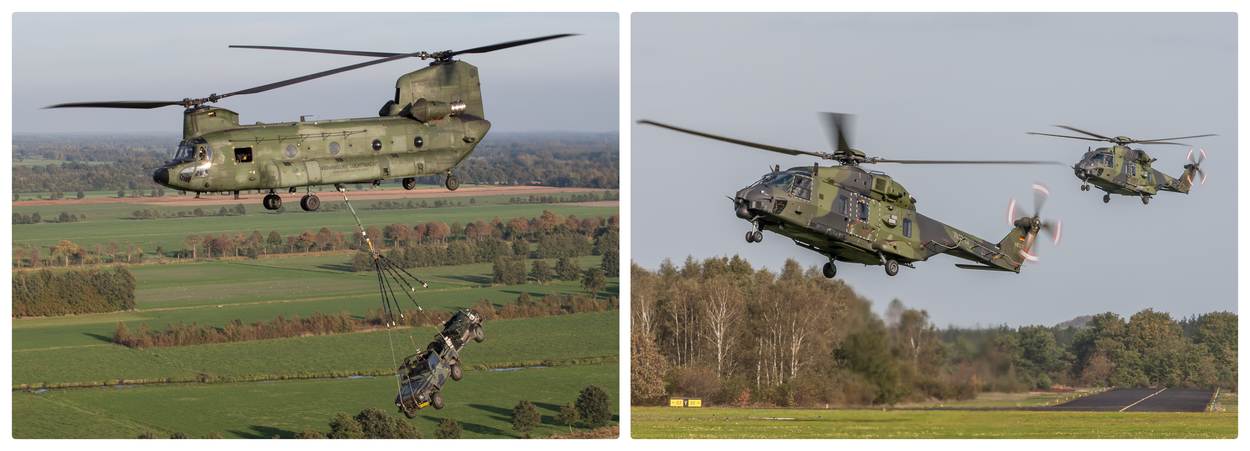 Een Nederlandse Chinook en 2 Duitse NH90’s. Aan het begin van Falcon Autumn zijn afspraken gemaakt tussen de Nederlandse en Duitse vliegers. Na een paar keer oefenen en finetunen ging het samen vliegen soepel. Foto links: adjudant Arnoud Schoor, rechts: Ludo Mennes