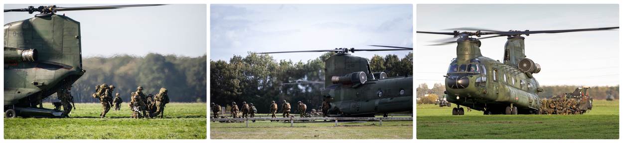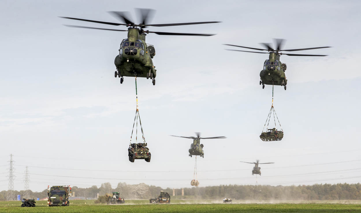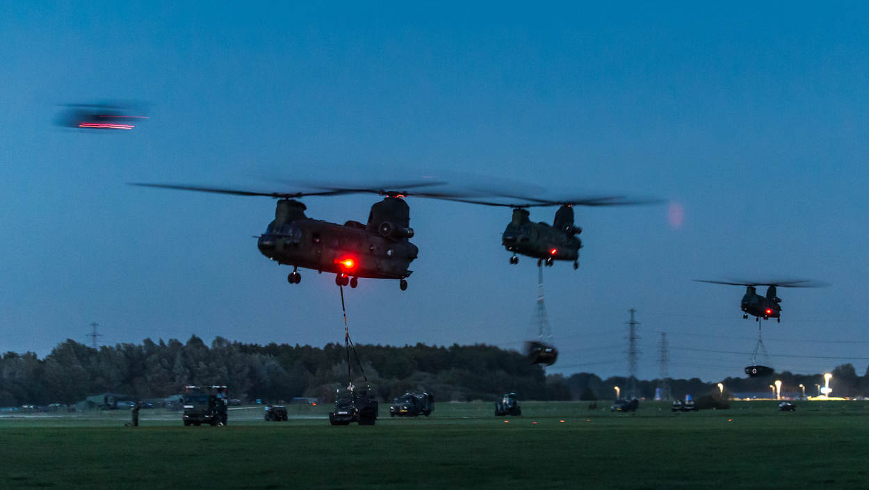 Ook ’s avonds gaan de vluchten door. Hier pikken Chinooks (en een wegvliegende Duitse NH90) op het oefenterrein De Haar in Assen hun lading op, op weg naar de Marnewaard. Foto: Marco Ferrageau