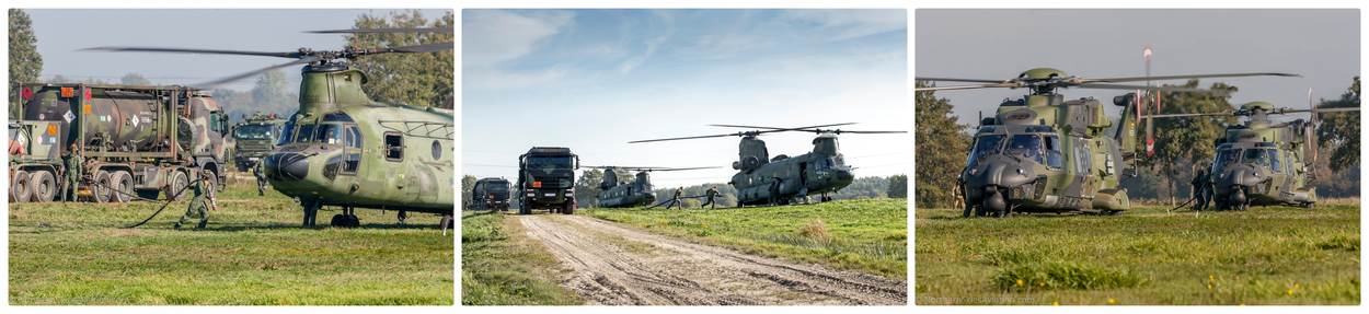 Duits en Nederlands personeel tankt Chinooks en NH90’s bij op het FARP. Foto’s links en rechts: Ludo Mennes, midden sergeant-majoor Gerben van Es