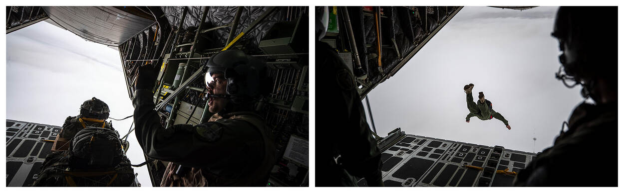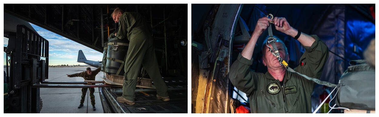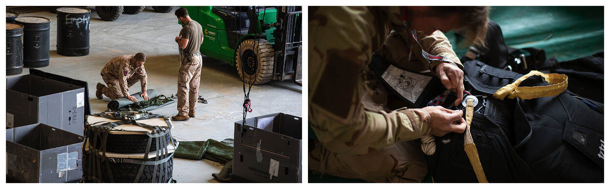 De bevoorradingscompagnie (Bevo) van 11 Luchtmobiele Brigade is ijverig in de weer met het ‘preppen’ van de vracht. Bepakken, afwegen, knopen, insnoeren. Alles om ervoor te zorgen dat loadmaster Belinda straks met de kant-en-klare pakketten in de weer kan. Tegelijkertijd legt de afdeling Vliegveiligheidsuitrusting de laatste hand aan het passend maken van zuurstofmaskers voor de springers, worden in het geïmproviseerde kantoor van de afdeling Communicatie- en Informatiesystemen (CIS) alle verbindingen nog een laatste keer getest en zijn de Pathfinders van 11 Luchtmobiele Brigade enkele tientallen kilometers verderop de ‘drop zone’ aan het uitzetten. Alles om deze éne vlucht tot een goed einde te brengen.