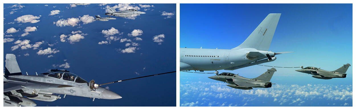 De KC-30A heeft zowel een boom als een hose and drogue aan boord. Met die laatste worden de meeste fighters bijgetankt zoals deze US Navy Growler (l.), maar bijvoorbeeld ook Franse Rafales. Foto links: Peter Borys, RAAF. Foto rechts: Captain Pedro, Armee de l’Air