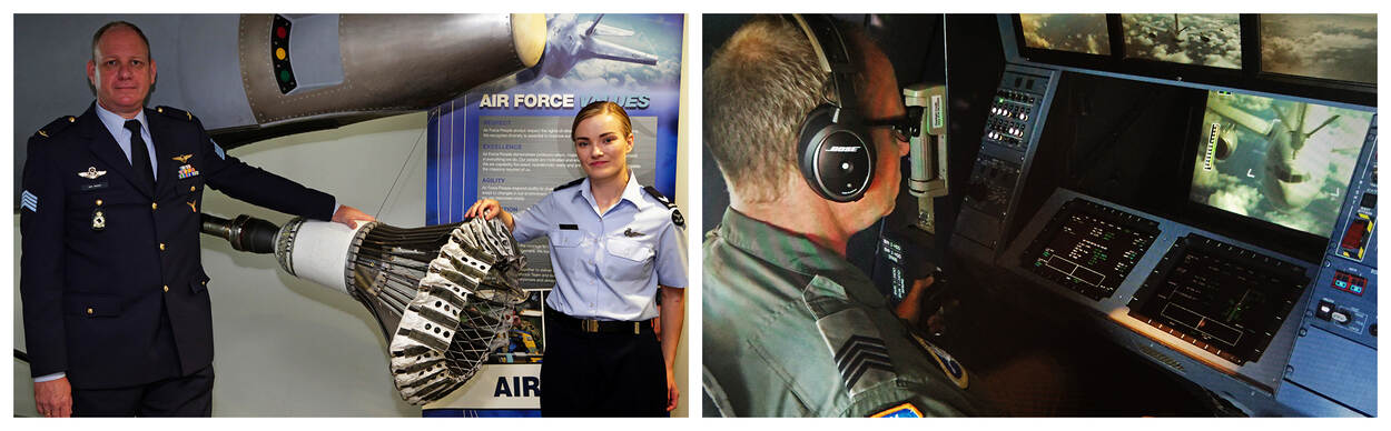 Links: Van Asselt poseert met de eerste vrouwelijke RAAF-collega Shannon bij de drogue, het ‘netje’ waarmee vanaf de vleugels wordt bijgetankt. Rechts bedient Van Asselt de boom waarmee hij een E-7 van brandstof voorziet.